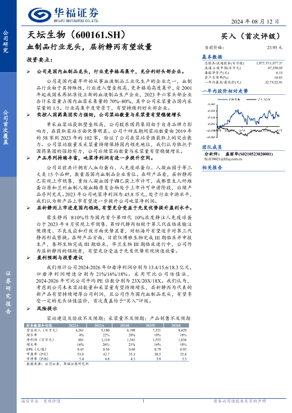 【华福证券】【20240812】天坛生物(600161)血制品行业龙头,层析静丙有望放量-21页