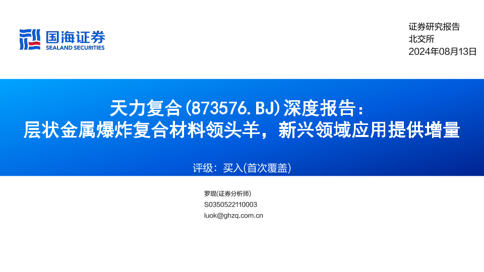 【国海证券】【20240813】天力复合(873576)深度报告:层状金属爆炸复合材料领头羊,新兴领域应用提供增量-28页