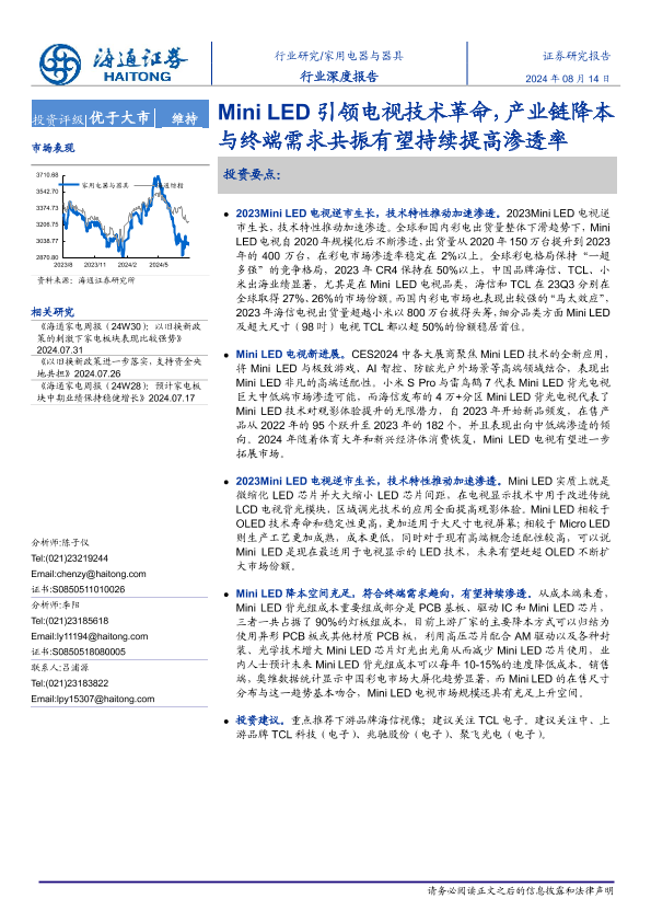 【海通证券】【20240814】家用电器与器具行业深度报告:Mini+LED引领电视技术革命,产业链降本与终端需求共振有望持续提高渗透率-25页