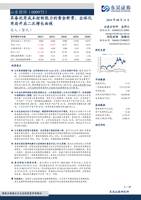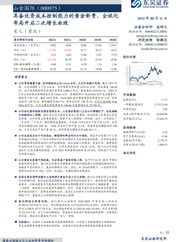 【东吴证券】【20240811】山金国际(000975)具备优秀成本控制能力的黄金新贵,全球化布局开启二次增长曲线-27页