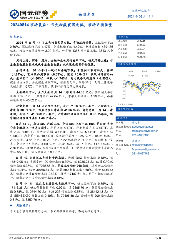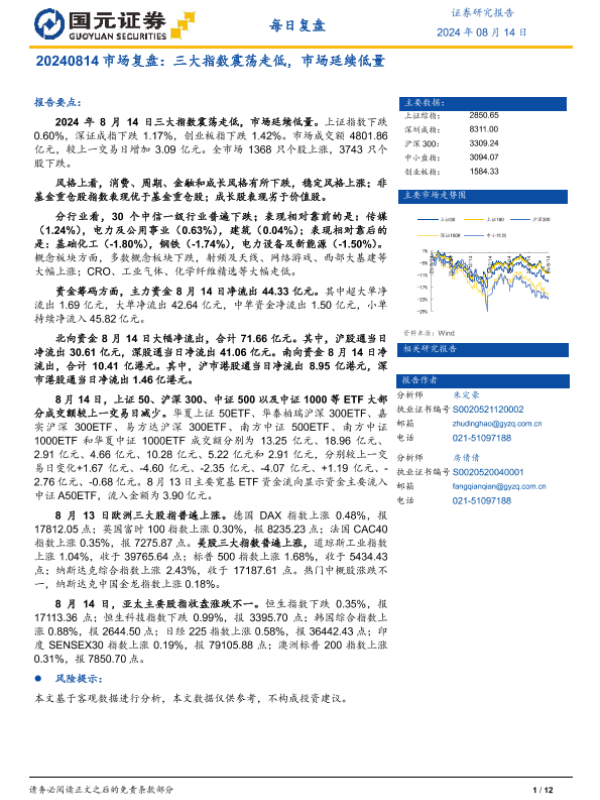 【国元证券】【20240814】市场复盘:三大指数震荡走低,市场延续低量-12页