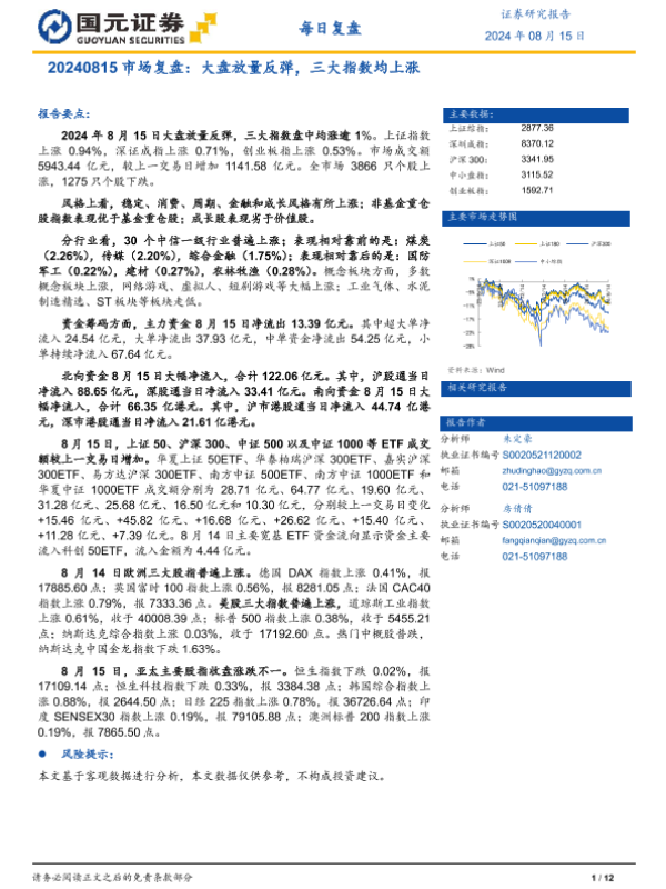 【国元证券】【20240815】市场复盘:大盘放量反弹,三大指数均上涨-12页
