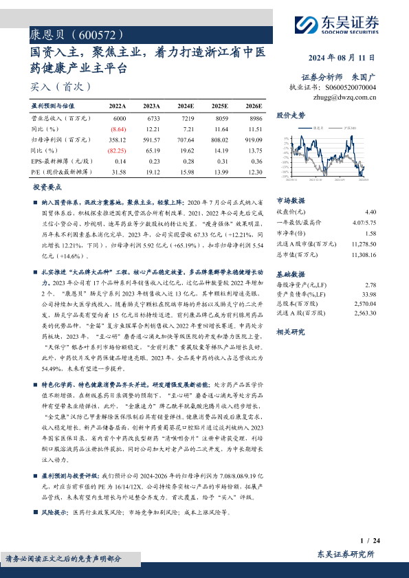 【东吴证券】【20240811】康恩贝(600572)国资入主,聚焦主业,着力打造浙江省中医药健康产业主平台-24页