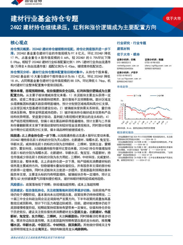 【国信证券】【20240814】建材行业基金持仓专题:24Q2建材持仓继续承压,红利和涨价逻辑成为主要配置方向-15页