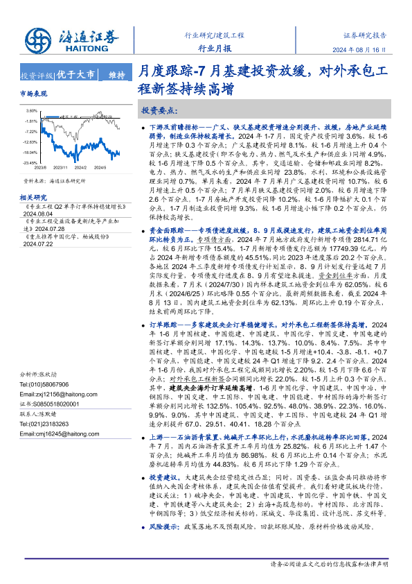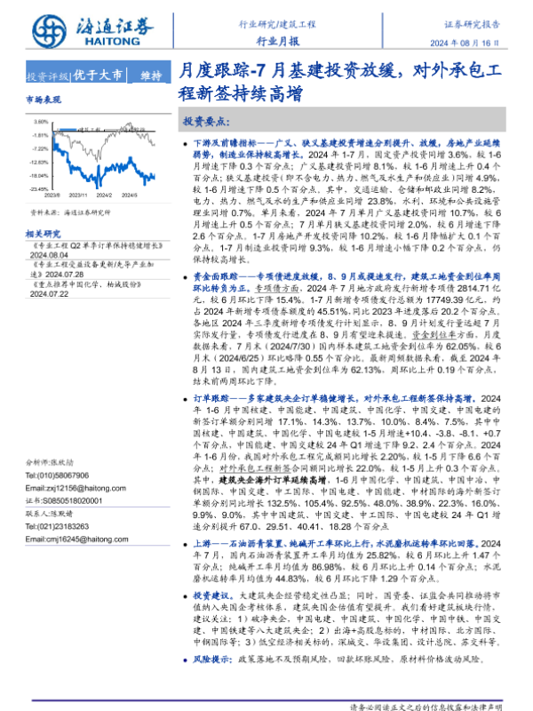 【海通证券】【20240816】建筑工程行业月报跟踪:7月基建投资放缓,对外承包工程新签持续高增-13页