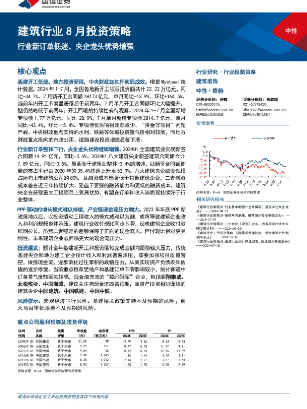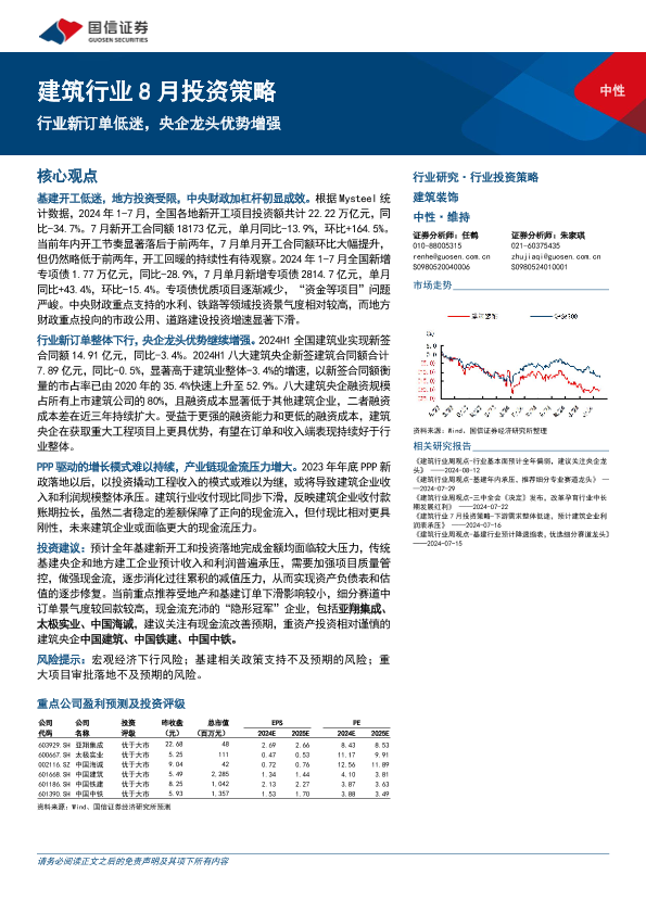 【国信证券】【20240815】建筑行业8月投资策略:行业新订单低迷,央企龙头优势增强-23页