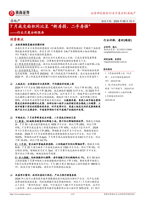 【浙商证券】【20240815】房地产行业月度分析报告:7月成交面积同比呈“新房弱,二手房强”-19页