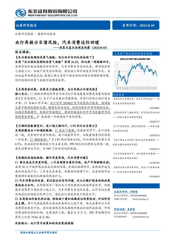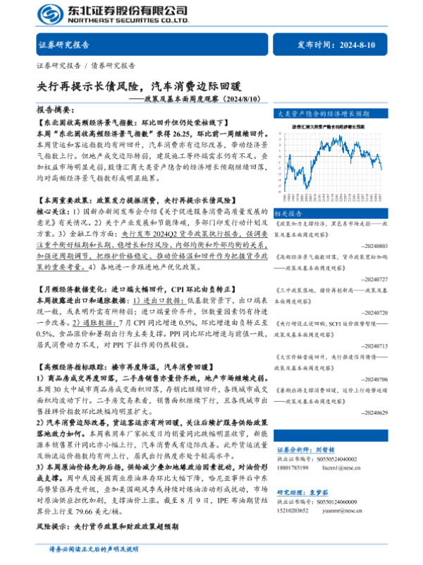 【东北证券】【20240810】政策及基本面周度观察:央行再提示长债风险,汽车消费边际回暖-31页