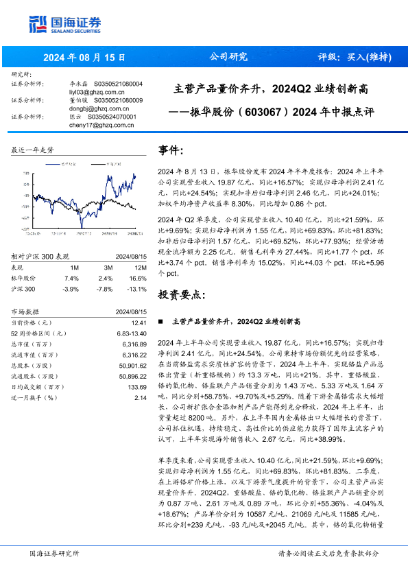 【国海证券】【20240815】振华股份(603067)2024年中报点评:主营产品量价齐升,2024Q2业绩创新高-10页