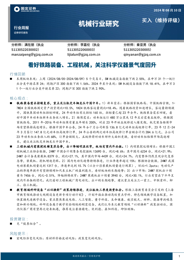 【国金证券】【20240810】机械行业研究:看好铁路装备、工程机械,关注科学仪器景气度回升-16页