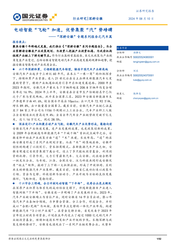 【国元证券】【20240810】汽车行业“深耕安徽”专题系列报告之汽车篇:电动智能“飞轮”加速,优势集聚“汽”势磅礴-52页
