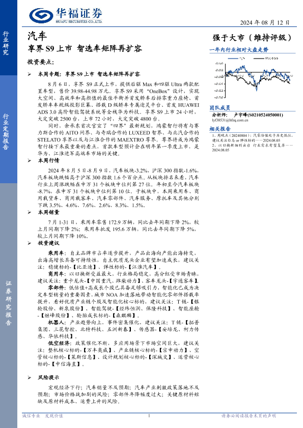 【华福证券】【20240812】汽车行业定期报告:享界S9上市,智选车矩阵再扩容-12页