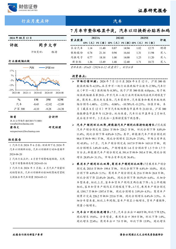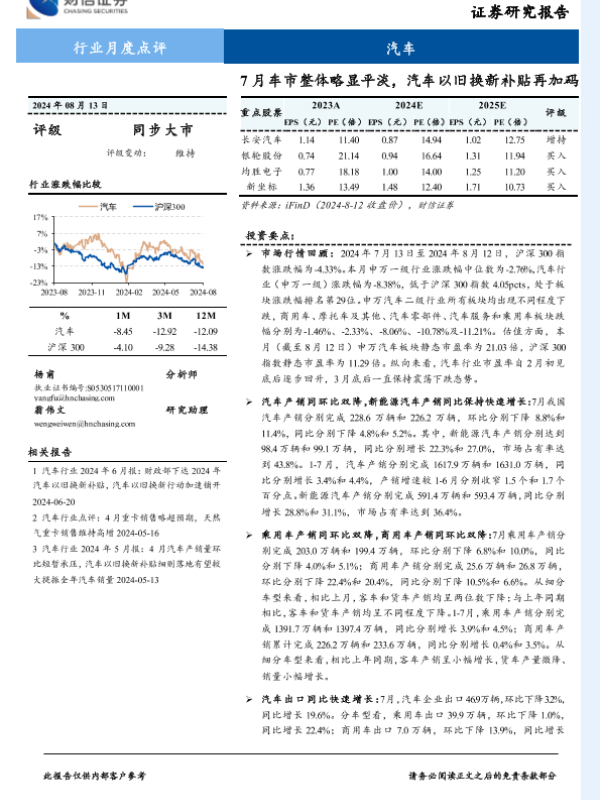 【财信证券】【20240813】汽车行业月度点评:7月车市整体略显平淡,汽车以旧换新补贴再加码-11页