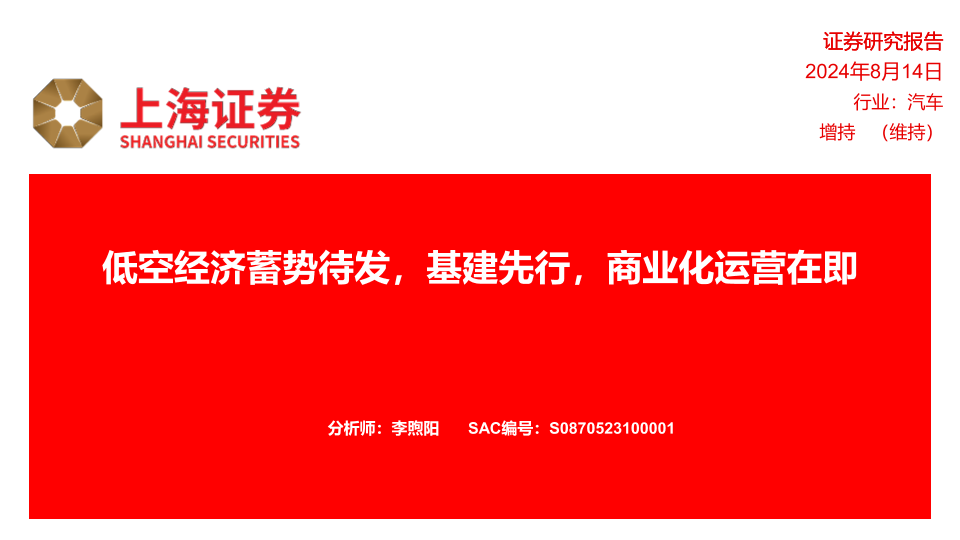 【上海证券】【20240814】汽车行业:低空经济蓄势待发,基建先行,商业化运营在即-24页
