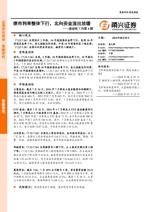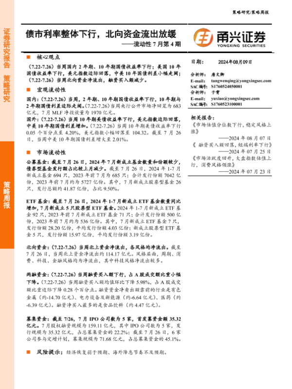 【甬兴证券】【20240809】流动性7月第4期:债市利率整体下行,北向资金流出放缓-11页
