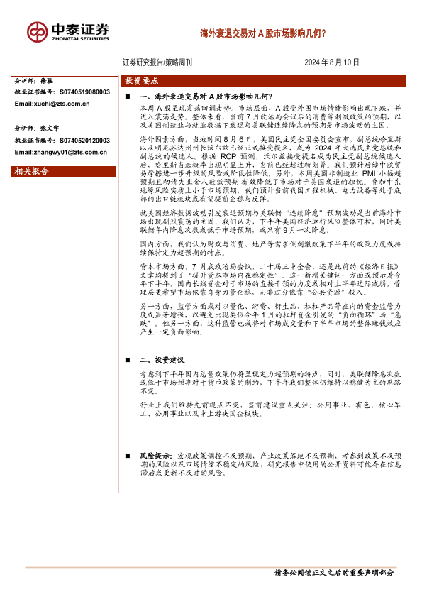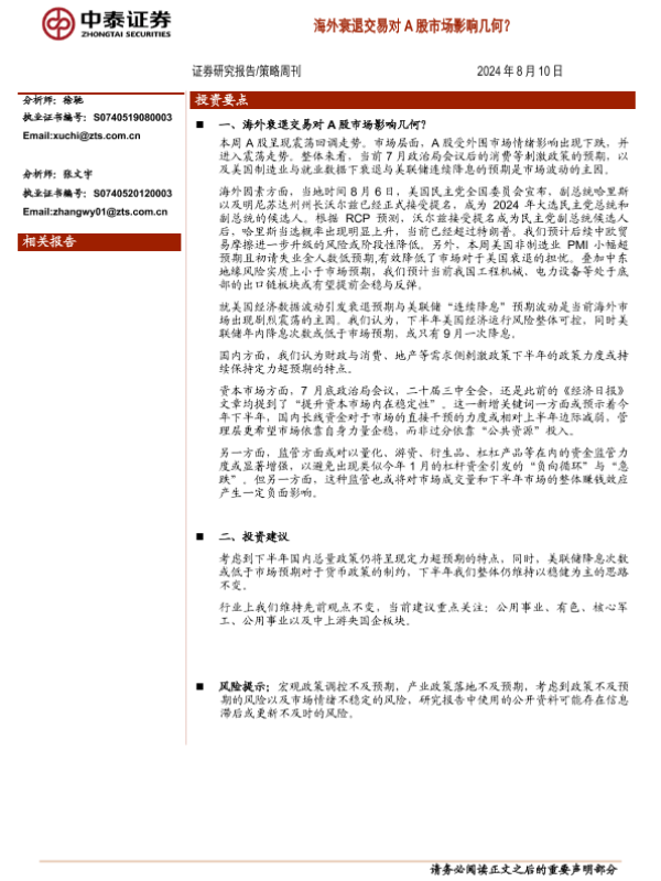 【中泰证券】【20240810】海外衰退交易对A股市场影响几何?-10页