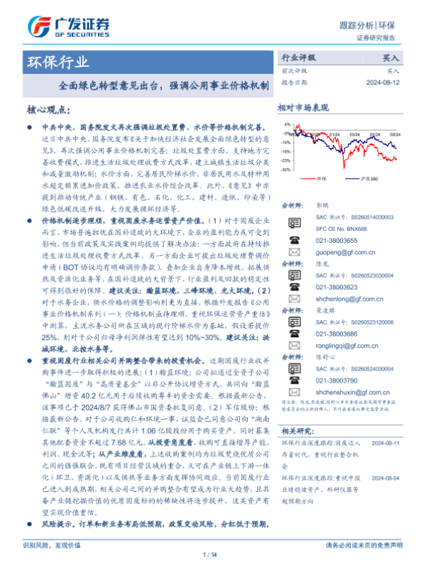 【广发证券】【20240812】环保行业:全面绿色转型意见出台,强调公用事业价格机制-14页