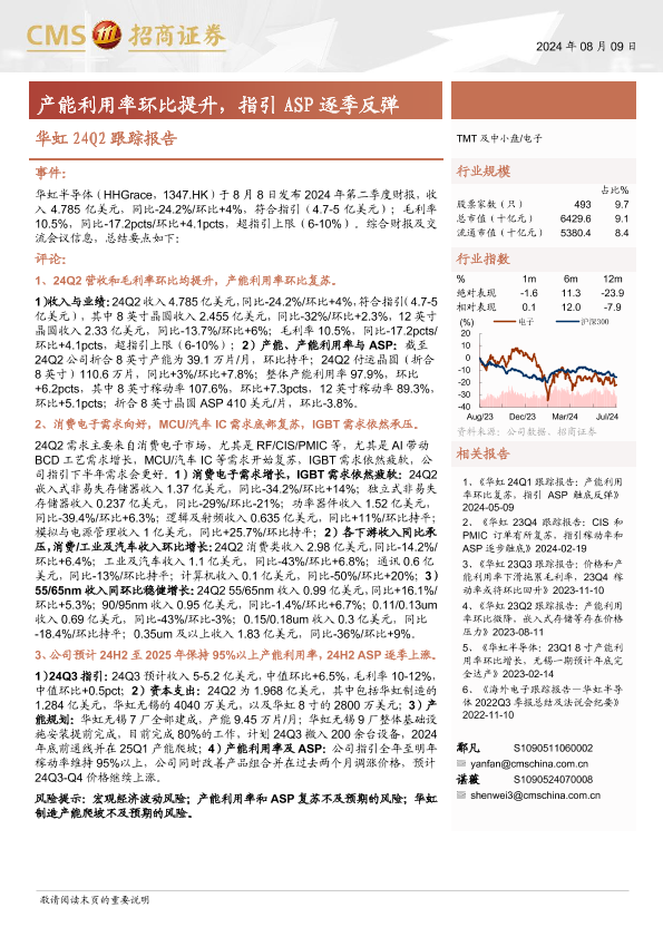 【海通证券】【20240809】电子行业华虹24Q2跟踪报告:产能利用率环比提升,指引ASP逐季反弹-11页