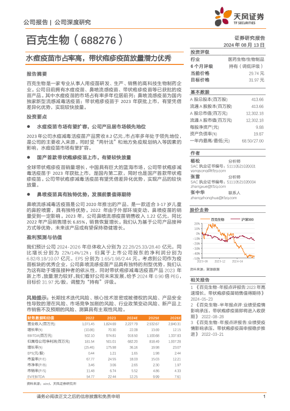 【天风证券】【20240813】百克生物(688276)水痘疫苗市占率高,带状疱疹疫苗放量潜力优秀-22页