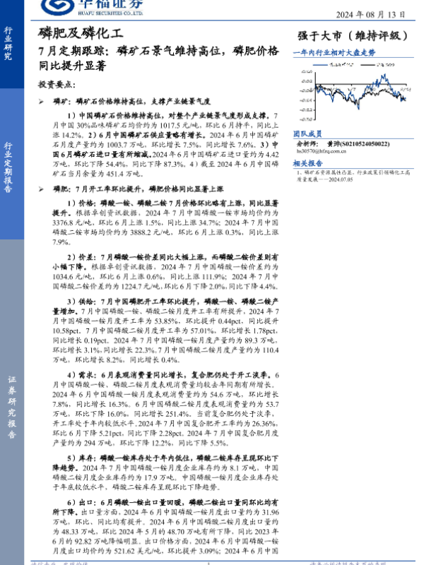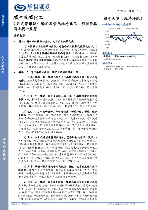 【华福证券】【20240813】磷肥及磷化工行业7月定期跟踪:磷矿石景气维持高位,磷肥价格同比提升显著-13页