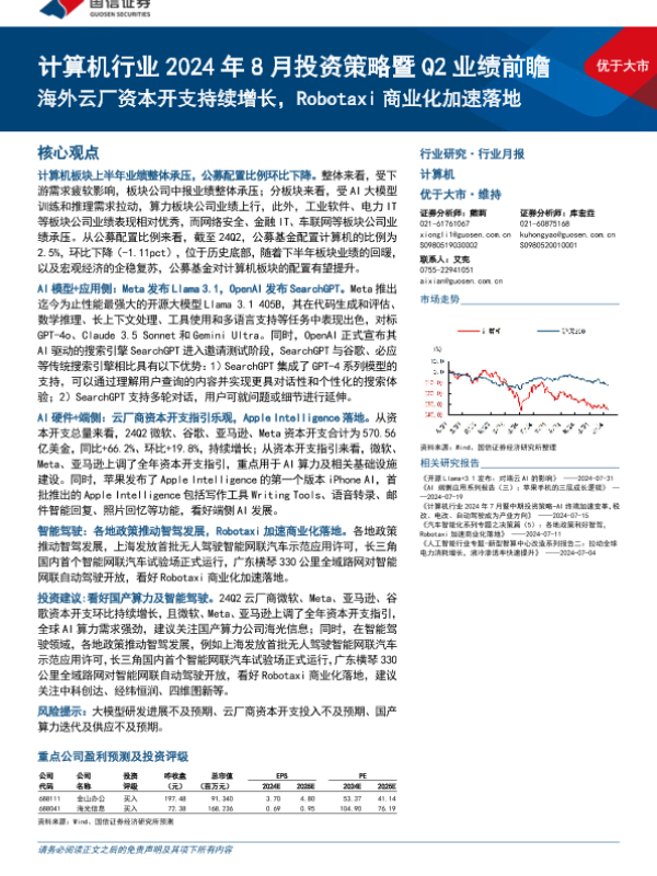 【国信证券】【20240812】计算机行业2024年8月投资策略暨Q2业绩前瞻:海外云厂资本开支持续增长,Robotaxi商业化加速落地-22页