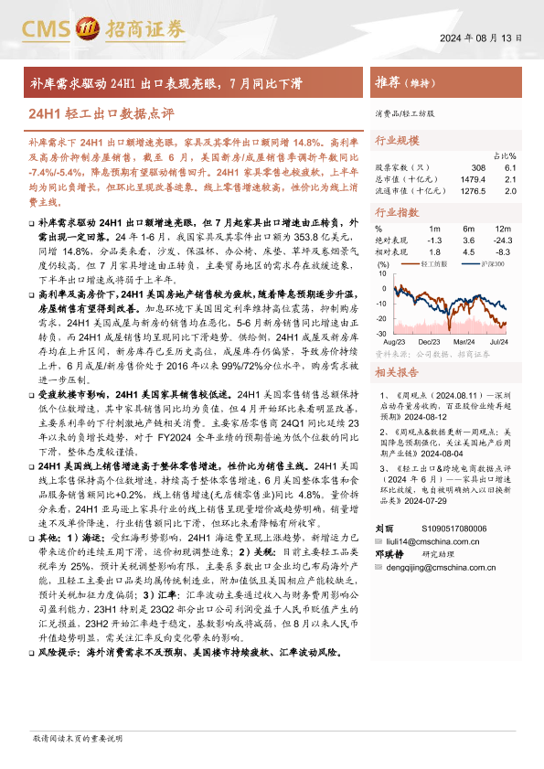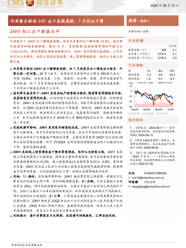 【海通证券】【20240813】轻工纺服行业24H1轻工出口数据点评:补库需求驱动24H1出口表现亮眼,7月同比下滑-16页