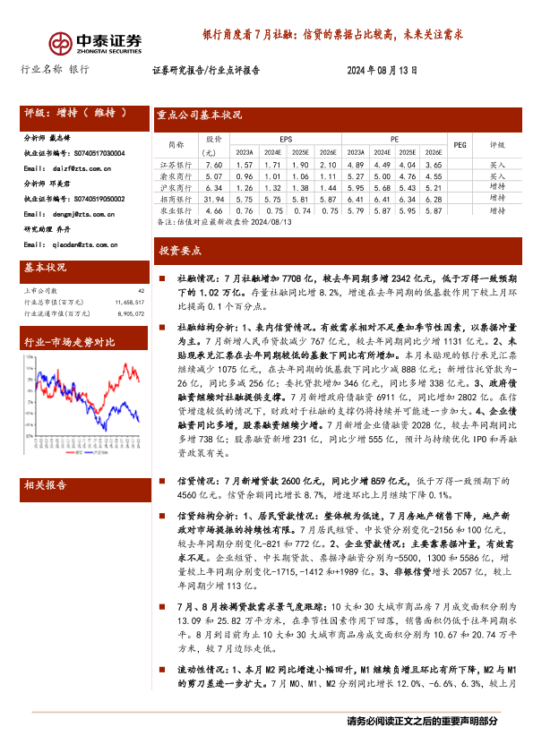 【中泰证券】【20240813】银行业银行角度看7月社融:信贷的票据占比较高,未来关注需求-14页