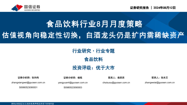 【国信证券】【20240812】食品饮料行业8月月度策略:估值视角向稳定性切换,白酒龙头仍是扩内需稀缺资产-26页