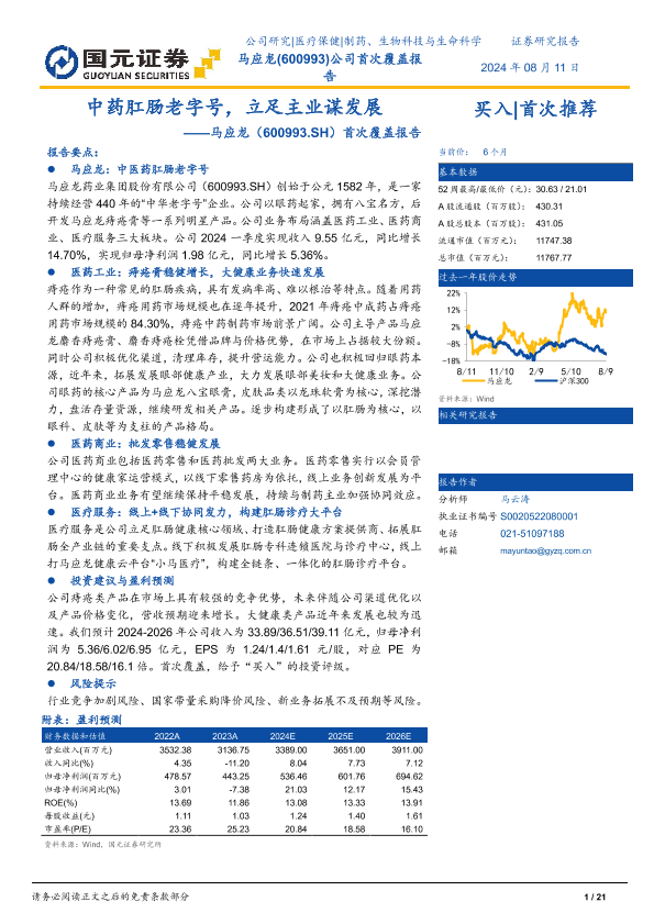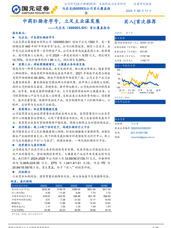 【国元证券】【20240811】马应龙(600993)首次覆盖报告:中药肛肠老字号,立足主业谋发展-21页