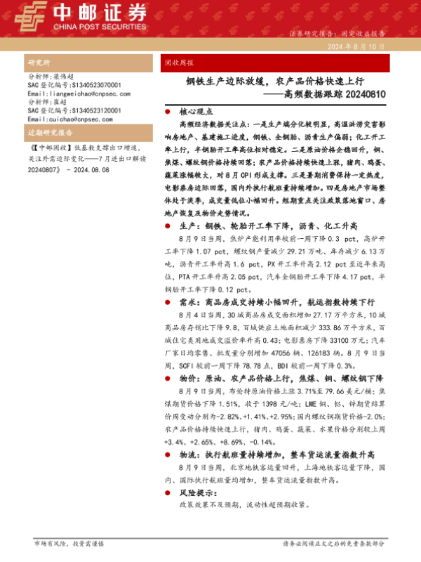 【中邮证券】【20240810】高频数据跟踪:钢铁生产边际放缓,农产品价格快速上行-13页