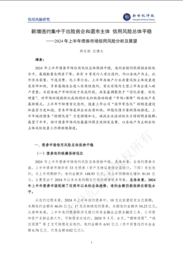 【研发部 武博夫】【20240101】新增违约集中于出险房企和退市主体 信用风险总体平稳——2024年上半年债券市场信用风险分析及展望-12页