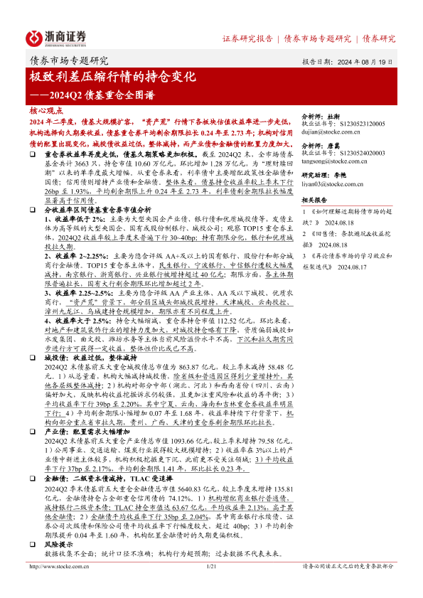 【浙商证券】【20240819】2024Q2债基重仓全图谱:极致利差压缩行情的持仓变化-21页