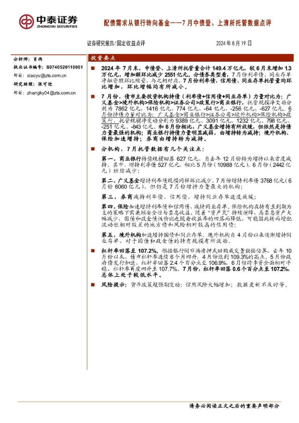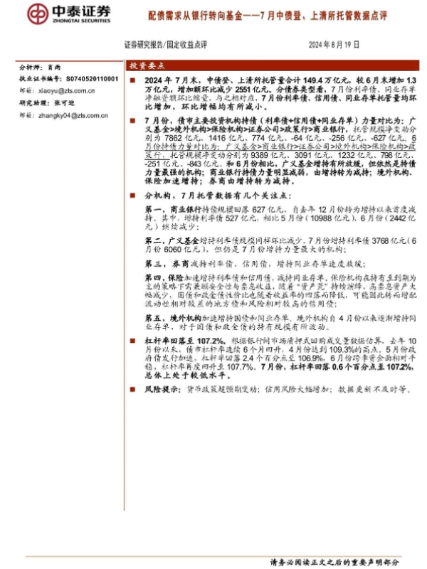 【中泰证券】【20240819】7月中债登、上清所托管数据点评:配债需求从银行转向基金-11页