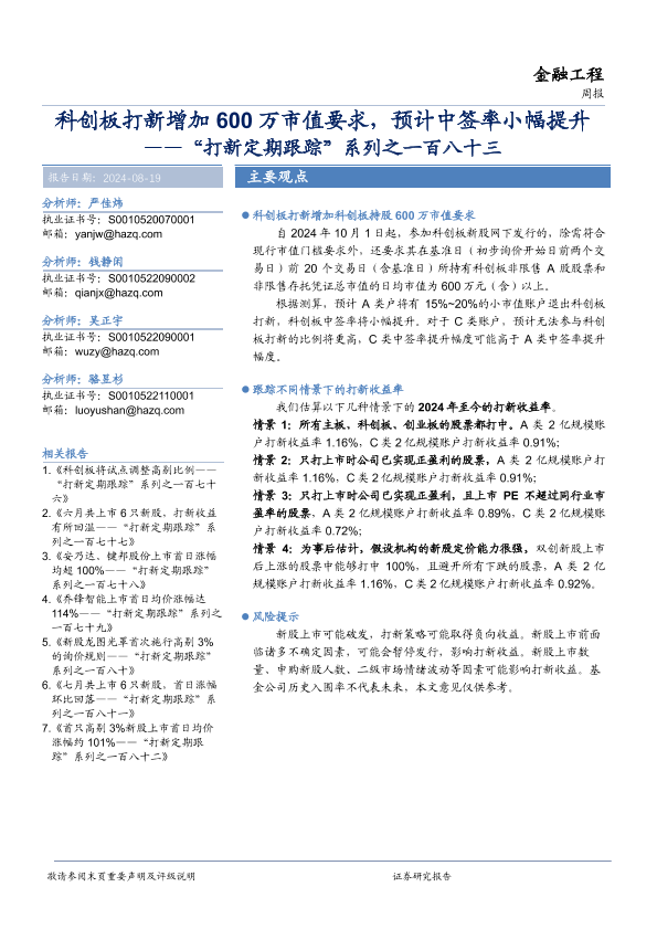 【华安证券】【20240819】“打新定期跟踪”系列之一百八十三:科创板打新增加600万市值要求,预计中签率小幅提升-16页