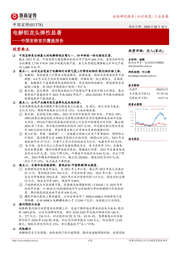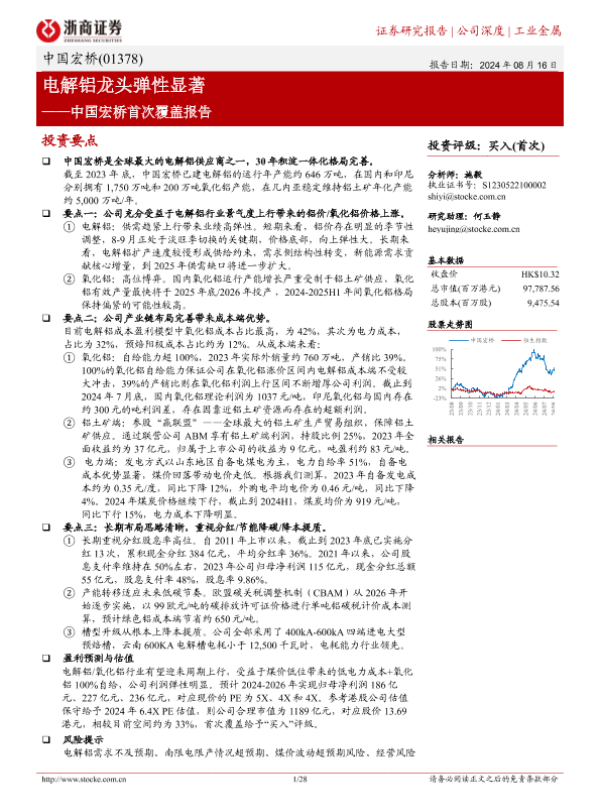 【浙商证券】【20240816】中国宏桥(01378.HK)首次覆盖报告:电解铝龙头弹性显著-30页