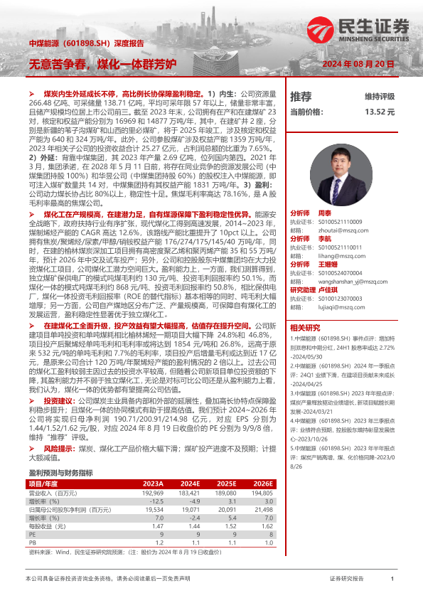 【民生证券】【20240820】中煤能源(601898)深度报告:无意苦争春,煤化一体群芳妒-32页