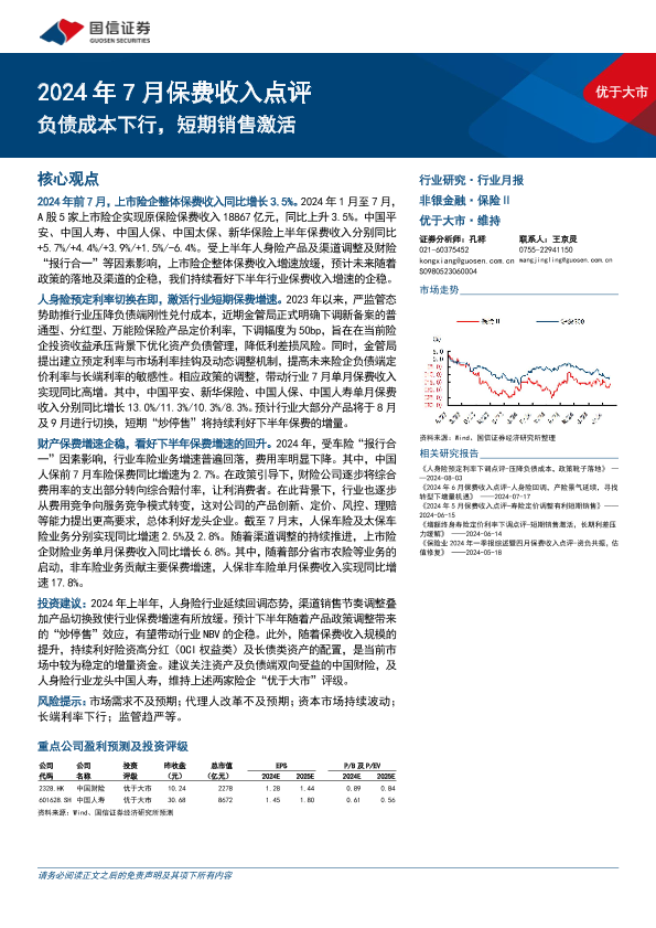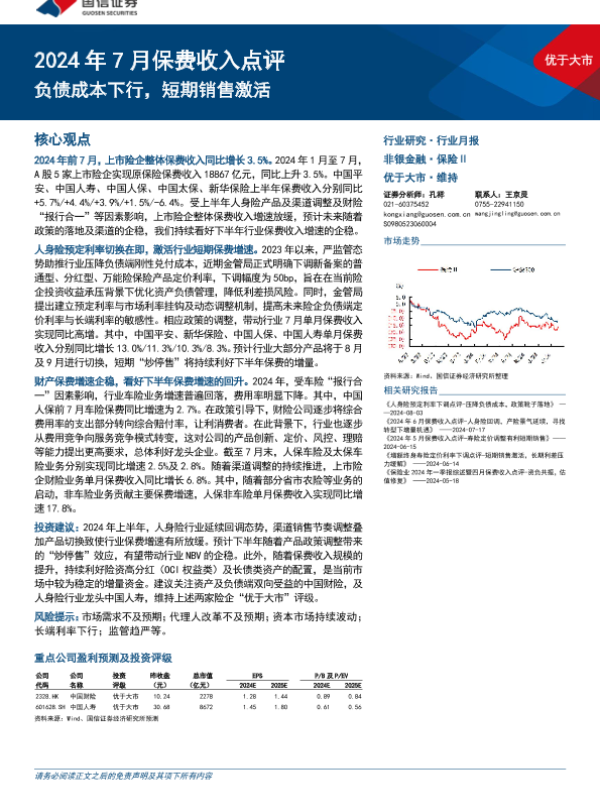 【国信证券】【20240816】保险行业2024年7月保费收入点评:负债成本下行,短期销售激活-10页