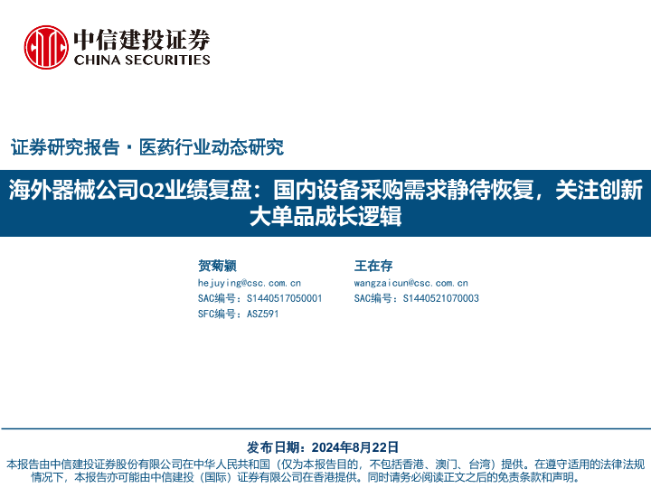【中信建投证券】【20240822】医药行业海外器械公司Q2业绩复盘:国内设备采购需求静待恢复,关注创新大单品成长逻辑-26页