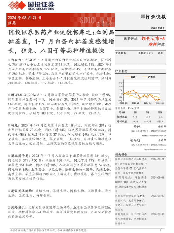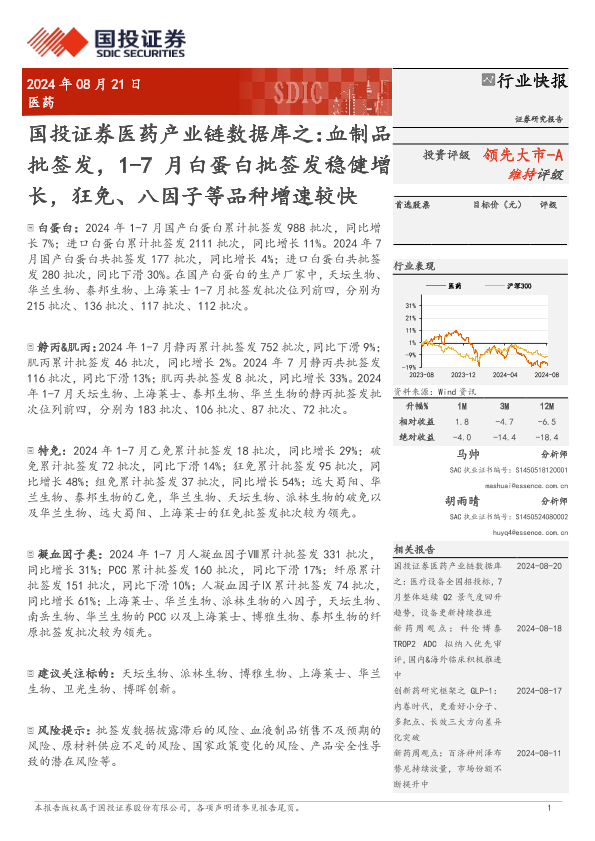 【国投证券】【20240821】医药行业产业链数据库之:血制品批签发,1-7月白蛋白批签发稳健增长,狂免、八因子等品种增速较快-13页
