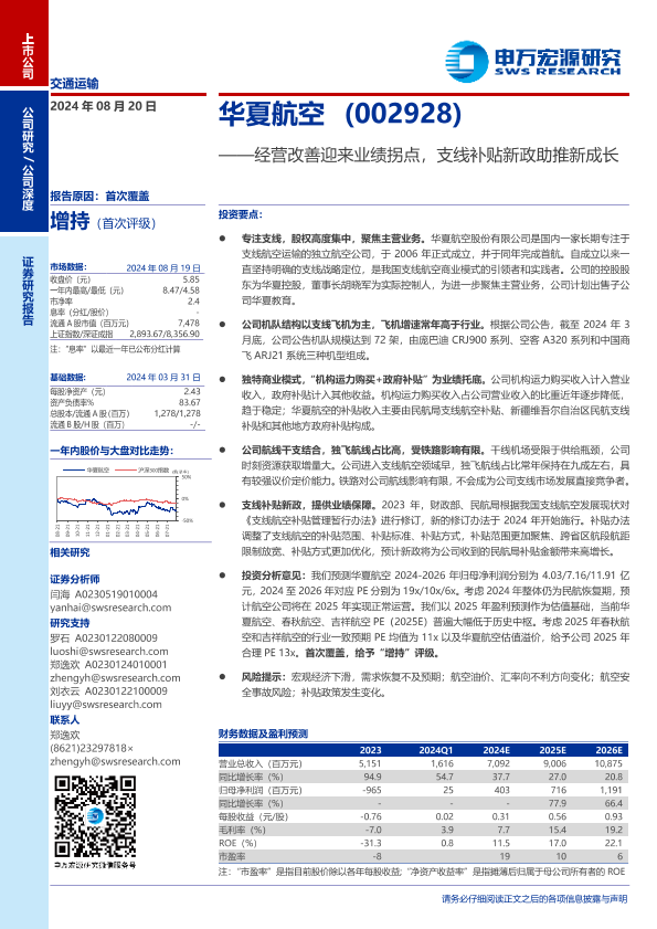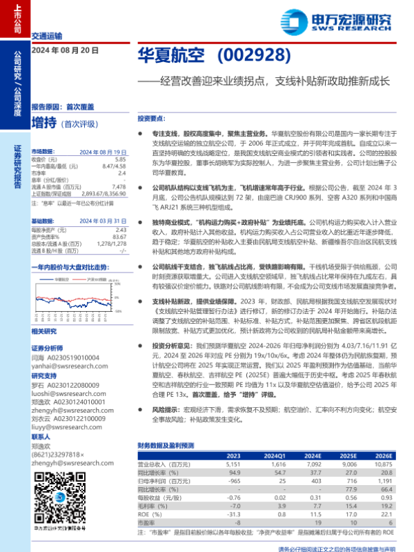 【申万宏源】【20240820】华夏航空(002928)经营改善迎来业绩拐点,支线补贴新政助推新成长-35页