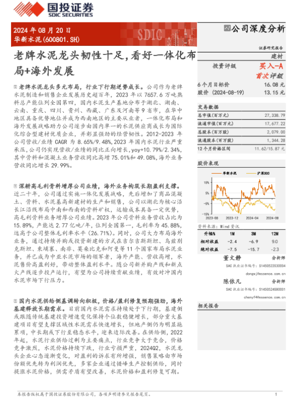 【国投证券】【20240820】华新水泥(600801)老牌水泥龙头韧性十足,看好一体化布局+海外发展-30页
