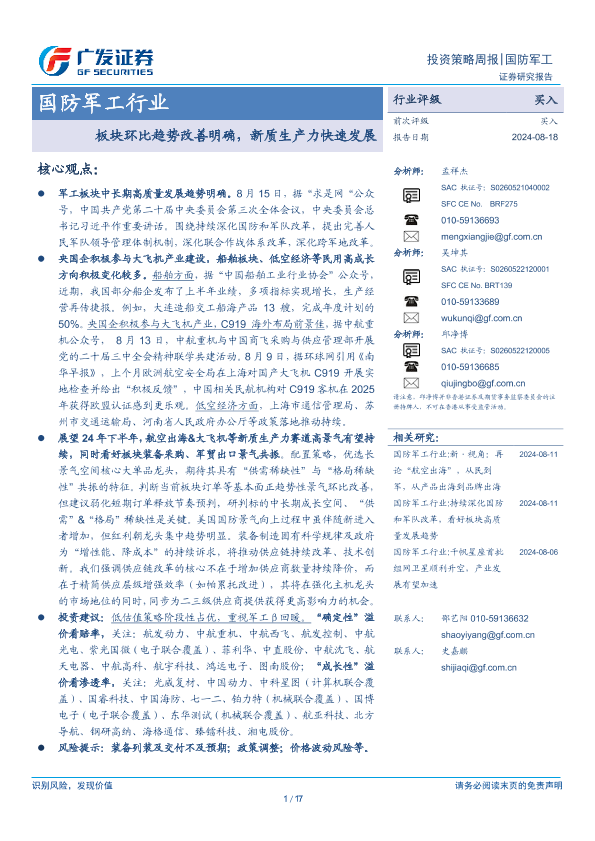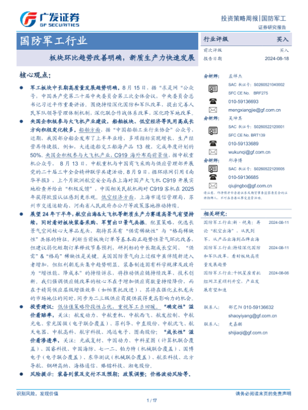 【广发证券】【20240818】国防军工行业:板块环比趋势改善明确,新质生产力快速发展-17页