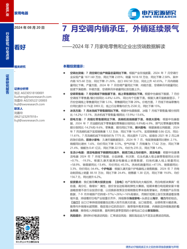 【申万宏源】【20240820】家用电器行业2024年7月家电零售和企业出货端数据解读-14页