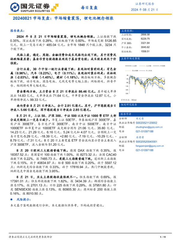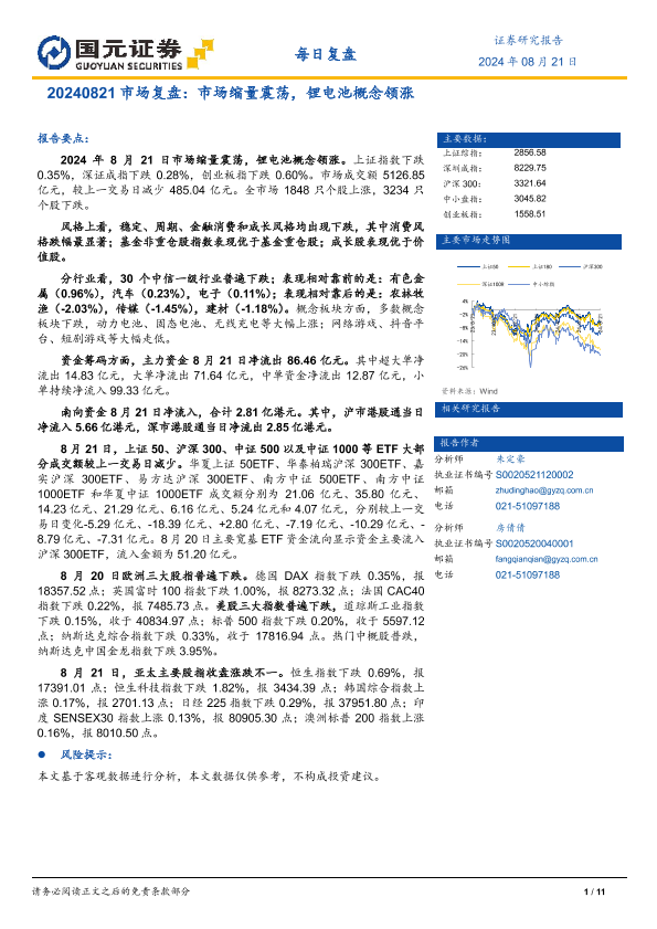 【国元证券】【20240821】市场复盘:市场缩量震荡,锂电池概念领涨-11页