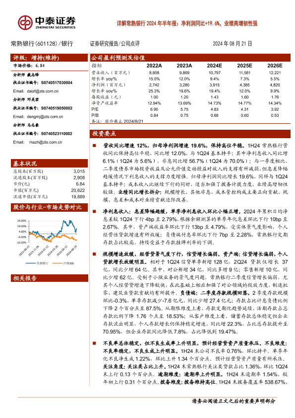 【中泰证券】【20240821】常熟银行(601128)详解常熟银行2024年半年报:净利润同比+19.6%,业绩高增韧性强-11页