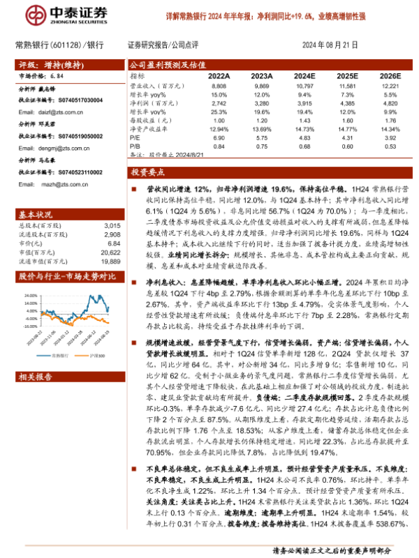 2024半年报 业绩分析 常熟银行 金融行业 银行财报