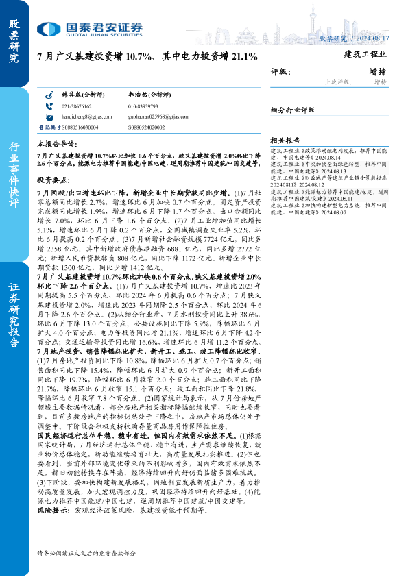 【国泰君安证券】【20240817】建筑工程行业:7月广义基建投资增10.7%,其中电力投资增21.1%-31页