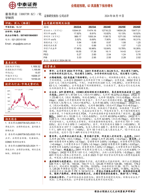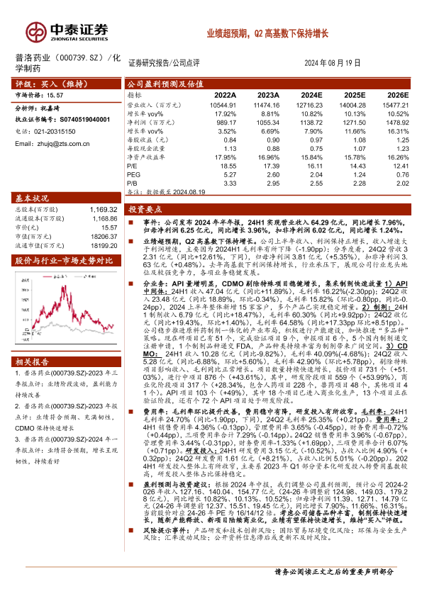 【中泰证券】【20240819】普洛药业(000739)业绩超预期,Q2高基数下保持增长-12页