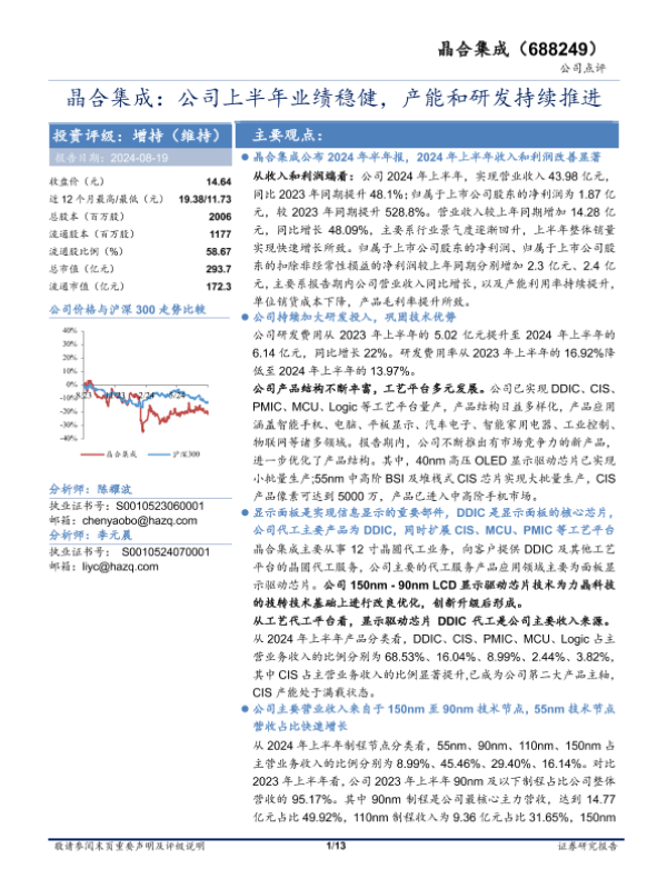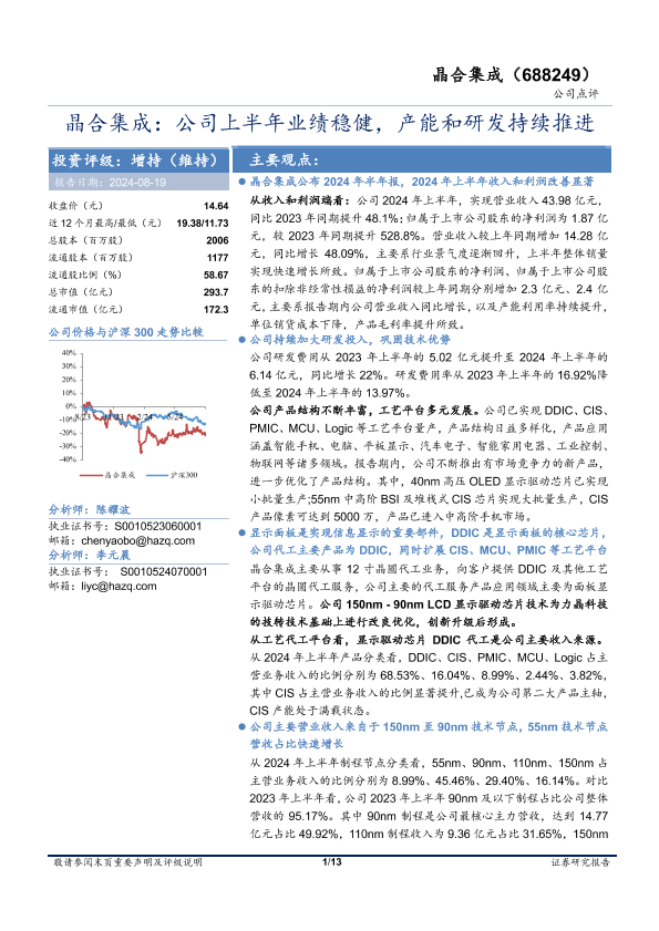 【华安证券】【20240819】晶合集成(688249)公司上半年业绩稳健,产能和研发持续推进-13页