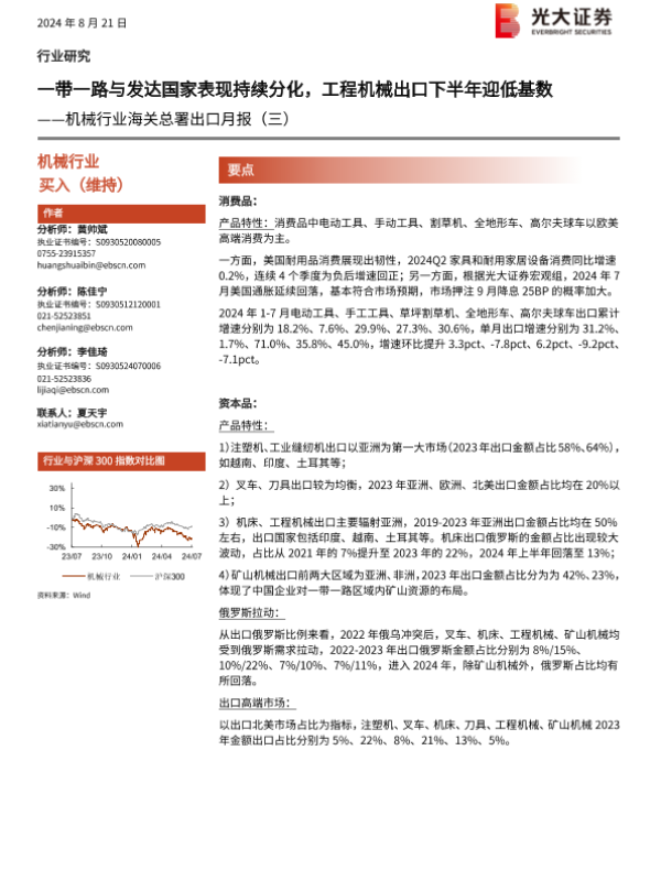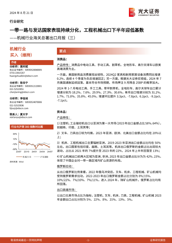 【光大证券】【20240821】机械行业海关总署出口月报(三):一带一路与发达国家表现持续分化,工程机械出口下半年迎低基数-16页